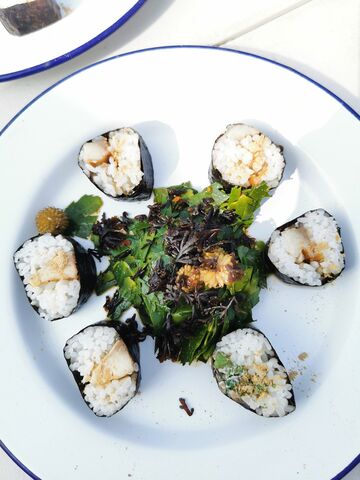 We usually prepare both a selection of vegan and smoked fish Sushi for the day.