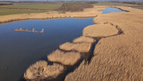 Aerial view of a body of water bordered by golden reedbeds and marshland, with fields and trees in the distance.