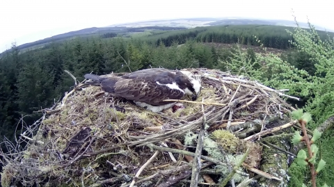 Kielder osprey incubating three eggs. Image by: Forestry Commission England.