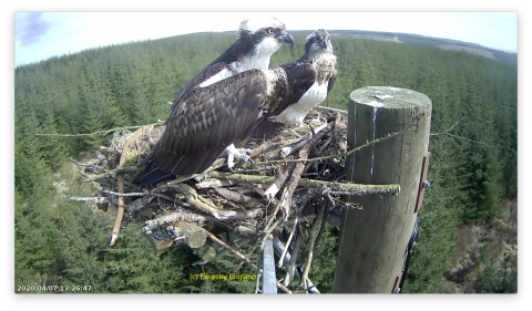 Happily, it is still be possible to keep an eye on how the birds are doing from the comfort of your own home. Forestry England has been very busy over the last few months preparing for the 2020 season: sprucing up the nest platforms; replacing cameras and working with consultants to ensure that all electronics are in place to provide us with reliable footage from the nests. Due to the current situation we are still working on safely obtaining footage from some nests but we are able to receive images from two of the nest platforms. This footage is being closely monitored by dedicated Osprey Consultant, Joanna Dailey. Joanna will be posting all the latest news and images on the Kielder Osprey Project blog throughout the breeding season, and has kindly provided us with the highlights to-date.
