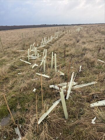 After multiple sessions planting upwards of 4500 trees to create a hedgerow, canes and tree guards were strewn across the site, with others smashed to pieces. It is estimated that damage was also caused to as many as 200 trees.