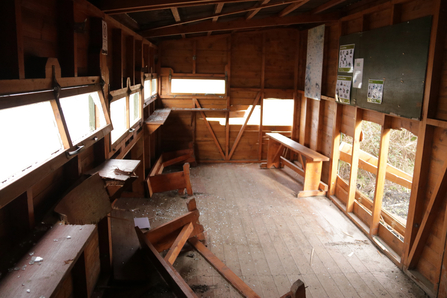 Now, on the site where so much effort was put into creating a haven for wildlife and people, vandals have struck again, this time smashing four of the wildlife-watching hides. The biggest hide, the Tern Hide has had the walls kicked, benches pulled out and hurled around inside and every window has been smashed.