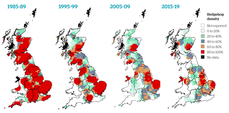 Road casualties Up to 335,000 hedgehogs are estimated to die on British roads annually. Habitat modelling suggests that suburbs and villages are hotspots, with 9% of Britain’s road network classed as dangerous for hedgehogs. |