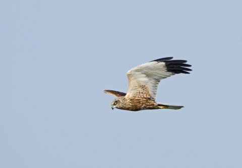 The largest of the harriers, the marsh harrier creates a distinctive V-shape in the air by holding its wings up. Females are chocolate-brown with a golden-yellow crown and throat. Males have a brown back, gingery belly, pale head and neck, and long, grey wings with black tips.