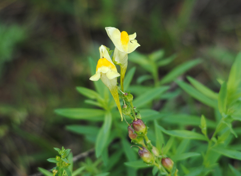 Look for common toadflax on waste ground and grassland, and along roadside verges and hedgerows. Its yellow-and-orange flowers are tightly packed on a tall spike and have distinctive 'spurs'.